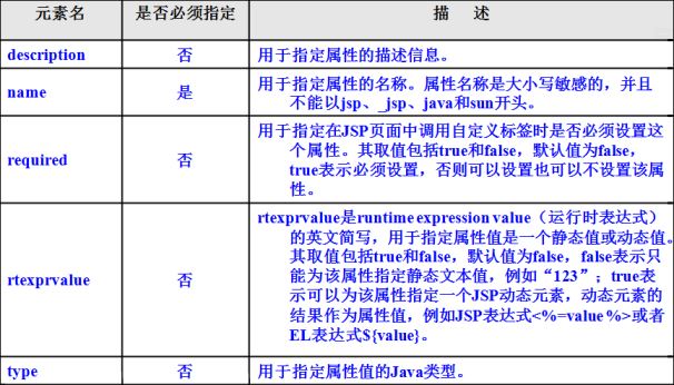② 在TLD文件中对于的tag>标签下添加属性的attribute>标签,同时attribute>标签下定义其从标签,其中name>从标签是必须要有的。attribute>标签所拥有的从标签如下: