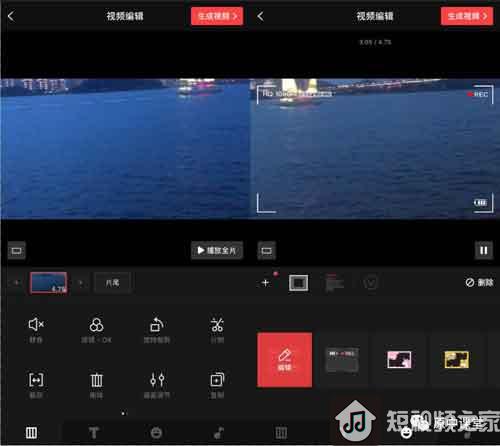 剪辑、拼接、添加字幕和转场效果,也可以视频与图片混剪,但暂时还不支持调色添加其他动态效果。