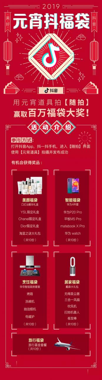 今晚24点前,打开抖音APP,抖一抖手机进入随拍页面,使用元宵专属道具拍随拍,成功发布视频,就会进入抽奖池,有机会赢取百万福袋大奖~