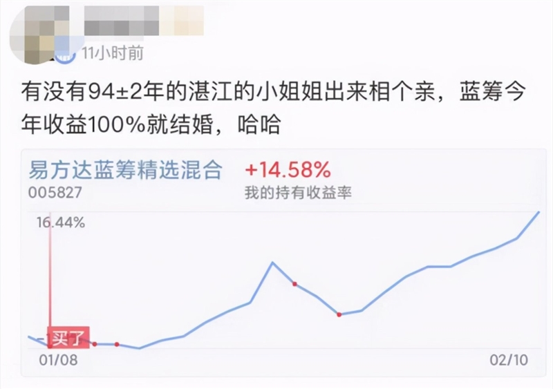春节期间,自大年初五“迎财神”之日起,一股“相亲旋风”席卷了支付宝基金讨论区,许多人在评论区里留下了自己的年龄地标职业以相亲交友。支付宝官微还亲自下场调侃了这件事。