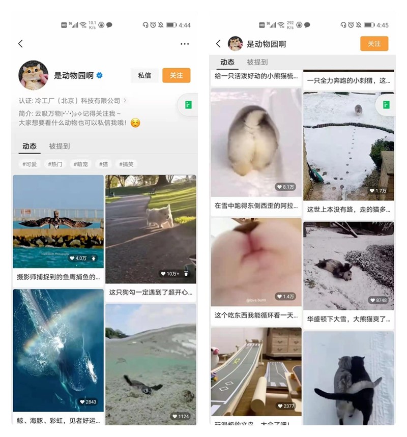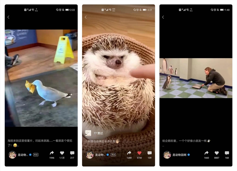 实际上,该账号视频内容可以说是比较常见的,主要记录各种动物很萌、很搞笑又或者让人惊讶的瞬间。比如有: