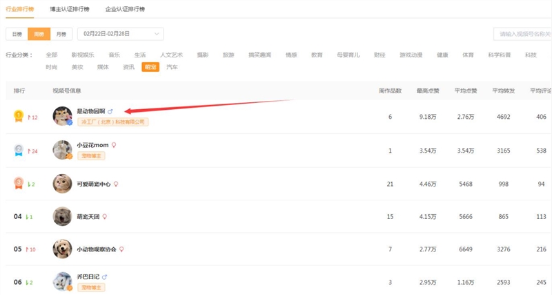 根据QuestMobile 报告数据分析,2020年全网萌宠类KOL的去重活跃用户规模已经达到5.3亿。用户规模到达一定规模,说明萌宠已然成为一个重要的内容创作垂直领域。那么萌宠类账号在视频号上表现又如何呢?