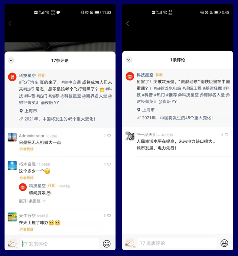 【科技星空】所发布视频涉及的内容主要为前沿科技,比如有白鹤滩水电站、小鹏飞行汽车、全能笔记本、海底发电站、华为折叠屏手机、京东首款送货无人机等让人感到新奇、牛X的科技,甚至还有太空探索等话题,可以说是包罗万象。