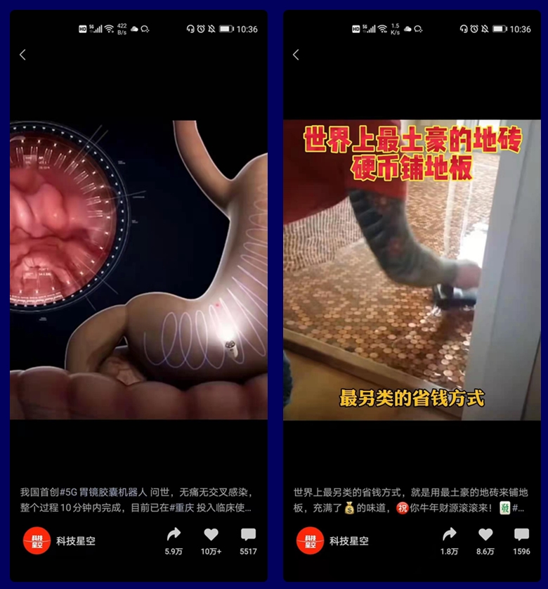 迄今为止,该账号点赞量最高的一个视频有10W+,内容是“我国首创5G胃镜胶囊”,讲述了这种胃镜胶囊是胃病患者的福音,整个过程10分钟内完成,目前已经投入临床使用。