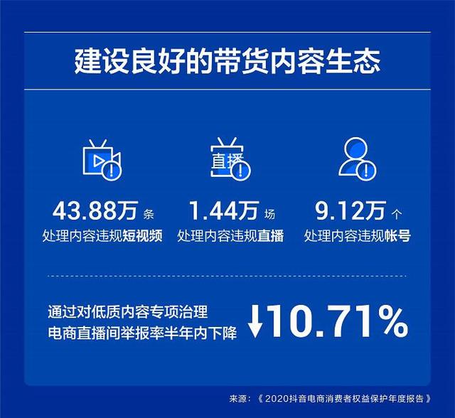 抖音电商在年报中明晰,良好的带货生态是内容电商可持续发展的根基,其对低质内容进行了专项治理,电商直播间举报率在半年内下降了10.71%。截至去年年底,该平台累计处理内容违规短视频43.88万条、内容违规直播1.44万场、内容违规帐号9.12万个。