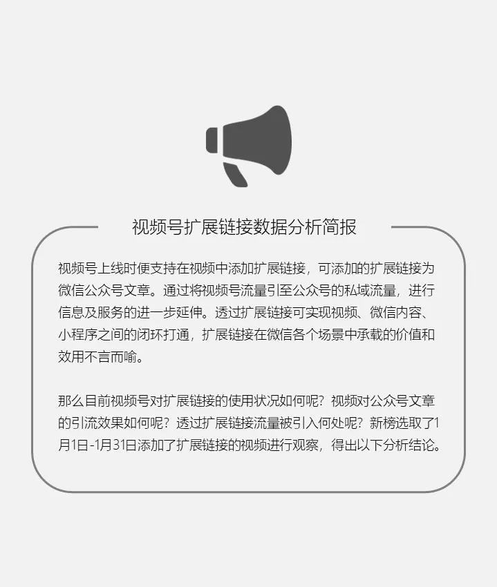 新榜统计了2020年8月至2021年1月期间,视频号发布内容中含扩展链接的视频(以下简称挂链视频)比例,6个月来从27%增至30%+,整体呈上升趋势。仅看2021年1月的数据可知,每100个视频动态中,约有31个含扩展链接;每100个视频号中,约有37个会在视频动态中挂链。这些扩展链接来自165787篇公众号内容,涉及公众号38813个。