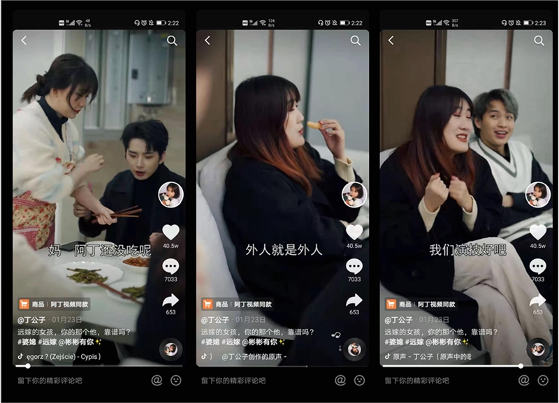 观察【丁公子】视频可以发现,每一期都有不同的主线,不同的创意,精准抓住情感痛点。比如有偶遇前男友、男友出轨、过年被催婚、拜金女、婆媳矛盾等各剧情,视频基本上都能获得几十万甚至上百万的点赞,可以说是每个视频都是爆款。