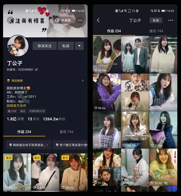 截至站长之家发稿时间,该账号从2019年5月至今,一共发布了744个作品,抖音粉丝数已经高达1264.2W,累计获赞数达1.8亿,其作点赞数从几十万到上百万不等。