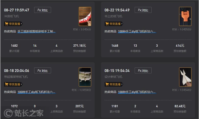 不过数据并不是很亮眼。数据显示,2020年8月份【123纸飞机】进行了多场直播,每场直播下来预估销售额从几十块到四五百之间,每场累计观看1000左右。