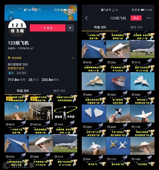看【123纸飞机】视频可以知道,其创作者也是纸飞机爱好者,经常捣鼓折出各种模型的纸飞机。进入该抖音账号的主页面,可以看到满屏封面都是纸飞机模型,可见其目标受众很明确也相对比较小众,不过这并不意味着粉丝群体会很少。