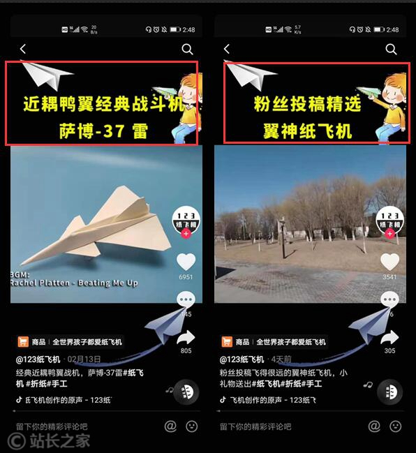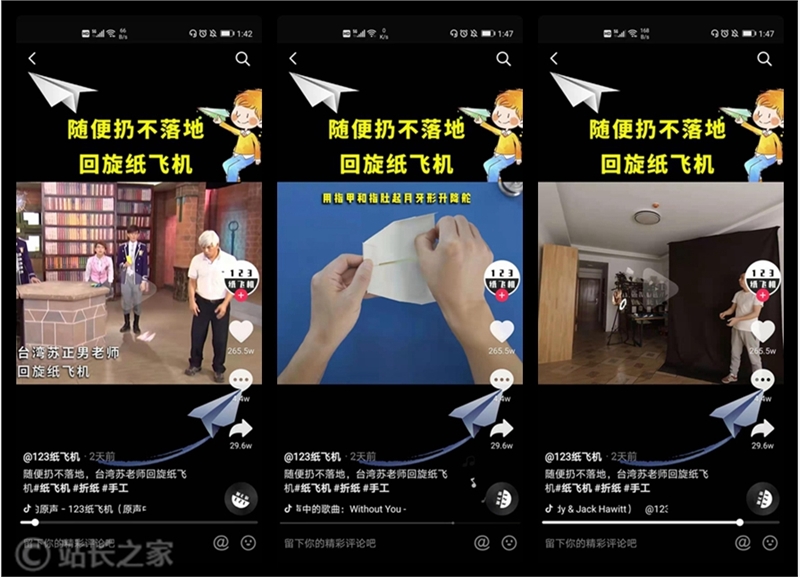 今天站长之家要分享的抖音账号【123纸飞机】可以给大家一个很好的借鉴思路。