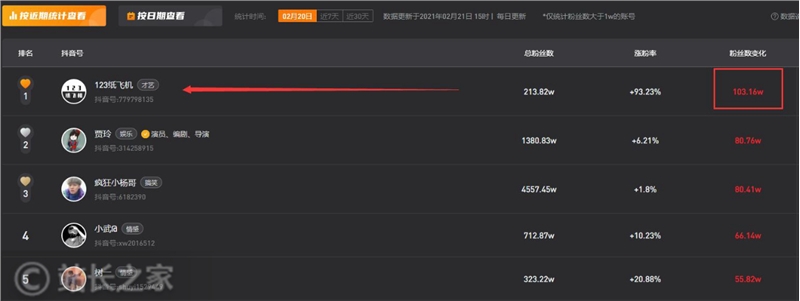 截至站长之家发稿时间,【123纸飞机】拥有233.8W粉丝,总获赞数为717.8W。值得注意的是,2月21日当天,靠一个视频新增粉丝数102.73w,视频点赞量265W,评论量4.4W。也就是这个爆火的视频为他带来了一半的粉丝量。