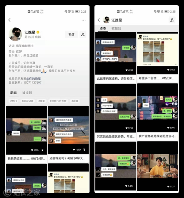 仔细观察【江挽星】发布的视频可以发现,其实视频内容表现的形式比较单一,大多数是将搞笑微信对话过程录制成视频,又或者微信对话截图和某段贴合聊天情景的网上搞笑视频制剪辑成一个视频。