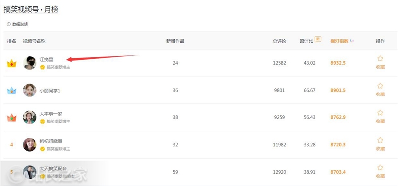 根据第三方平台视灯数据显示,该账号位居搞笑视频号月榜第一名,截至站长之家发稿时间,一共发布224个视频,【江挽星】十万赞作品数达14个,平均点赞数1.6W+,表现可以说是相当不错了。