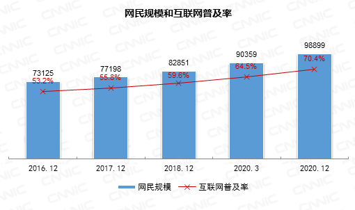 报告显示,截至2020年12月,我国网民规模达9.89亿,较2020年3月增长8540万,互联网普及率达70.4%,较2020年3月提升5.9个百分点。