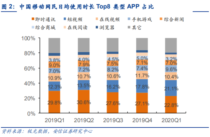 而在中国移动网民日均使用时长Top8类型APP占比中,我们发现短视频、在线视频合集使用占比在2020年第一季度已经达到31.5%,超过占比22.8%的即时通讯。