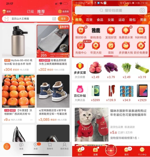 手淘的“猜你喜欢”(左)与拼多多首页(右)