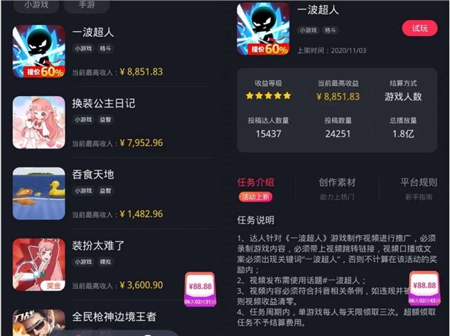 在抖音上搜索“游戏发行人计划”,可以发现很多小游戏任务。达人在指定周期内按照任务要求用短视频推广小游戏,便可以赚取现金收益。这类任务一般要求达人录制游戏内容,附上小游戏的跳转链接,视频口播或文案必须出现游戏名称,且在发布视频时要使用游戏的话题。视频收益取决于有多少用户通过视频点进了游戏链接,并参与了游戏。