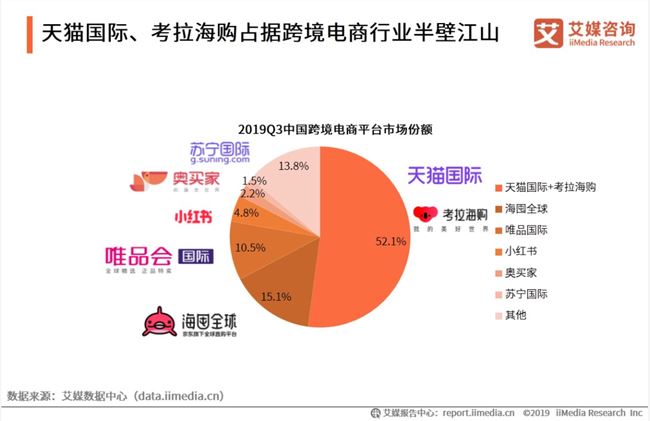 根据艾媒咨询发布的2019年Q3中国跨境电商市场监测报告显示,阿里旗下的天猫国际与考拉海购的市场份额合计达52.1%,其次是京东的海囤全球、唯品国际和小红书。