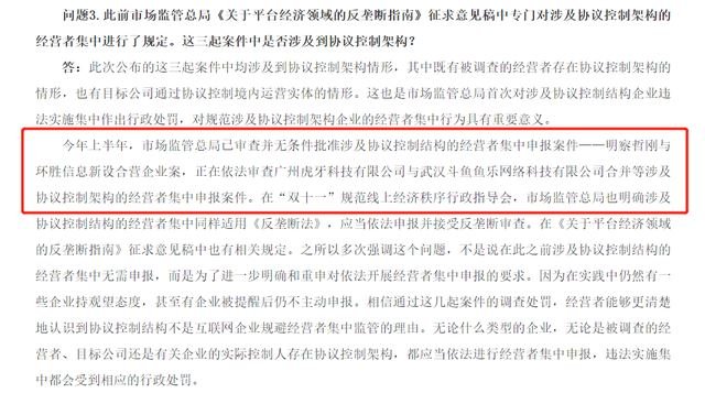 据国家市场监管总局官网消息,国家市场监管总局反垄断局主要负责人在接受媒体采访时透露,正在依法审查广州虎牙科技有限公司与武汉斗鱼鱼乐网络科技有限公司合并等涉及协议控制架构的经营者集中申报案件。