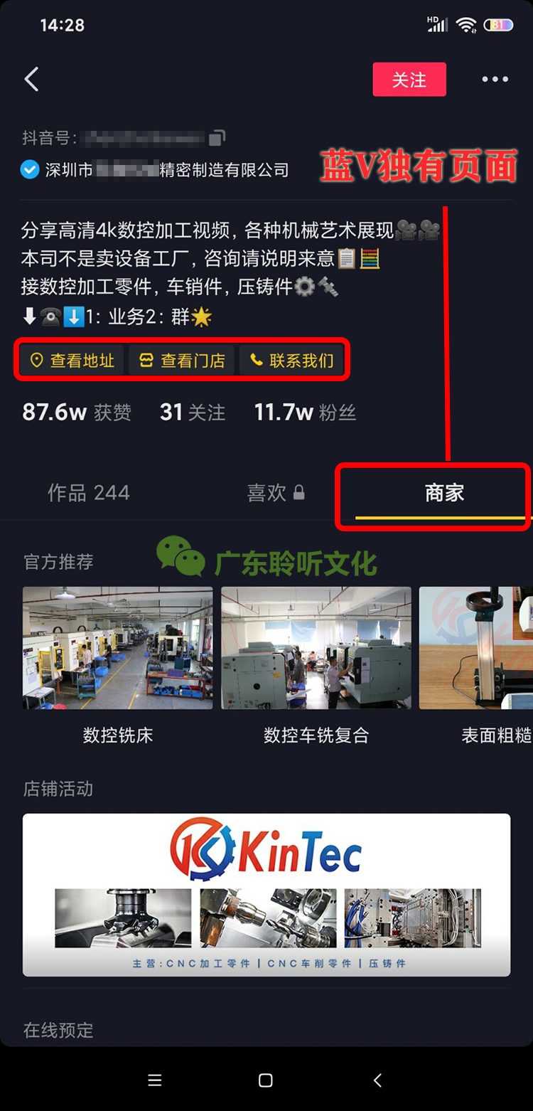 对于大部分抖音号来说,只有“作品”和“喜欢”两个模块。而如果开启了抖音蓝V认证,便可获得独特的“商家页面”,里面可以自由定义模块和外链功能,用途广泛。