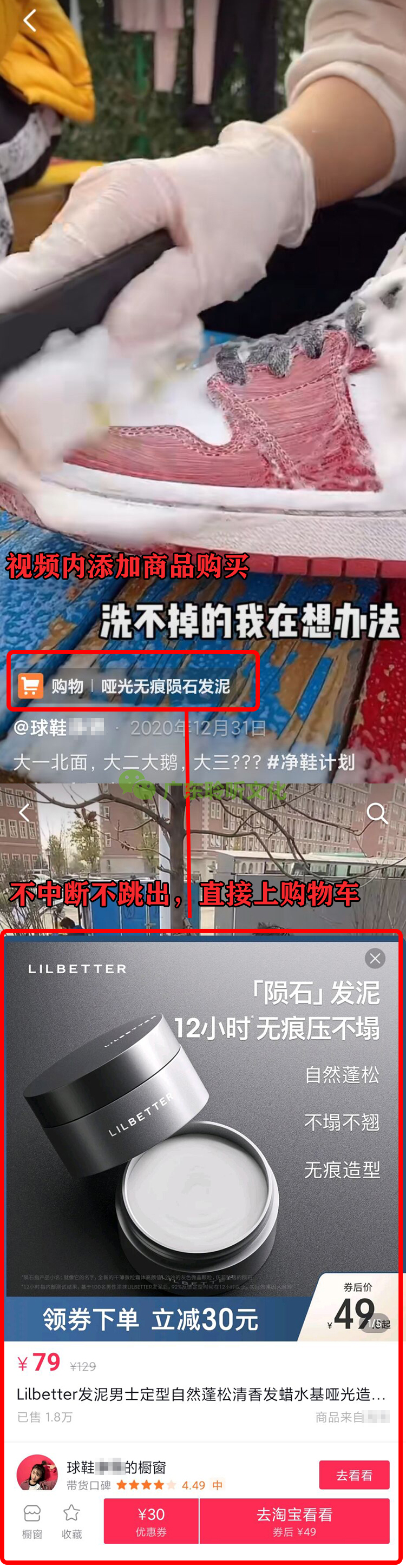 抖音企业蓝V的独家功能允许号主在视频内添加购物车通道,点击后跳出嵌入界面,不中断不加载新页面,帮助用户一键消费。