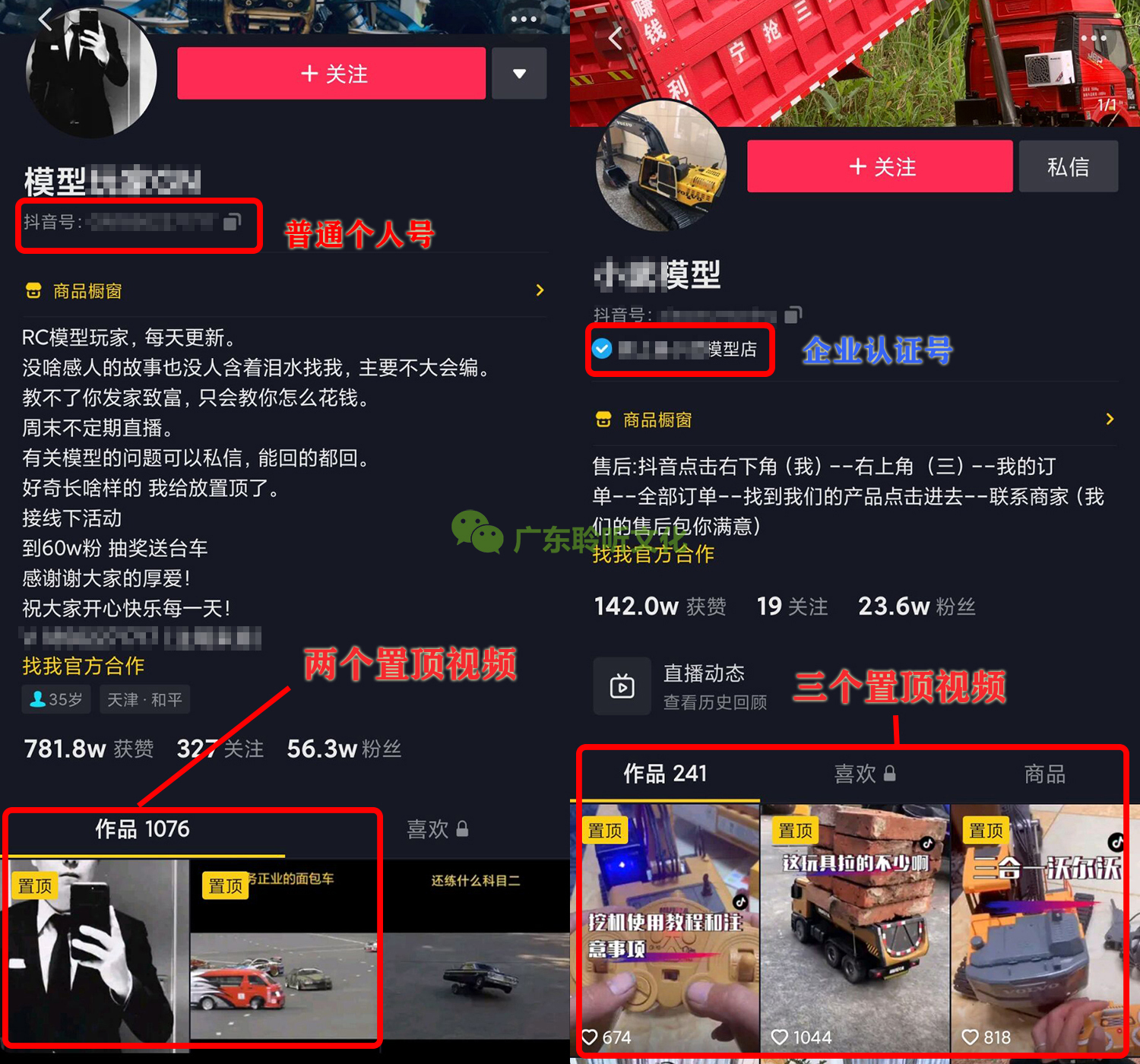 抖音蓝V一旦开通,即可置顶三个视频。反观个人号、个人认证者,则需要许多作品内容的积累、模糊但不低的粉丝门槛、二级商业运营资格的认证等才能置顶同样数量的视频。