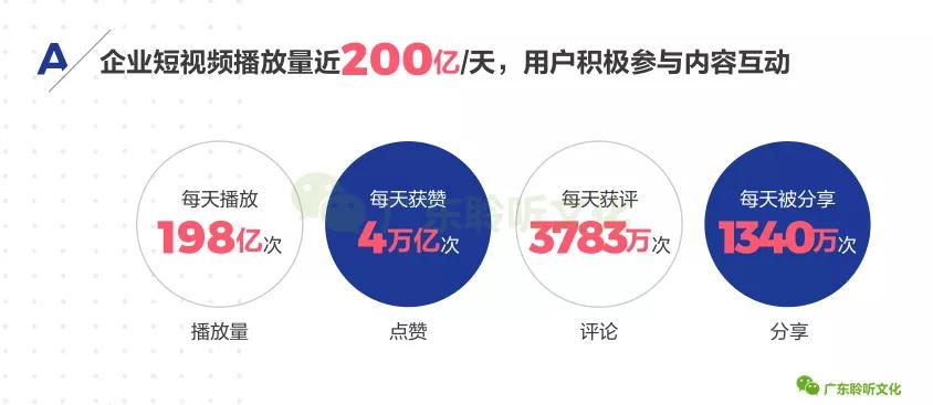 如图所示,企业短视频的播放量总量增多,每天获赞约4万亿次,用户更愿意参加内容和评论互动,除了生产短视频内容的力度加大以外,直播也成为企业号运营的高频动作。