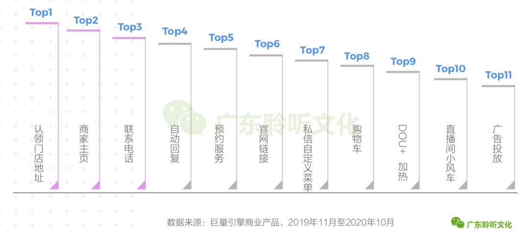 企业对各项专属能力及权益的应用越来越熟练,并逐渐探索出了最适合自身变现路径的功能。从各项功能配置增长幅度看,“门店地址”、“商家主页”、“联系电话”,成为2020年最受企业欢迎的功能”。各行业强烈关注的功能与经营路径高度匹配。
