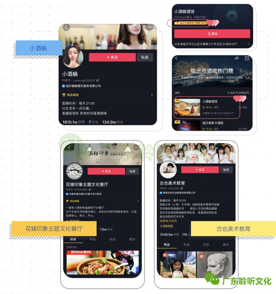 企业如何使用蓝V推广?上文提到,越来越多的品牌借助企业号打响名声,应用丰富的功能完成从0到1的品牌搭建。一批网红企业号由此诞生,如小酒蜗、花猪印象主题文化餐厅、古也美术教育。这些企业受益于“网红餐厅”“抖音打卡地”“新锐品牌”等盛名,不仅打响了本地知名度,而且吸引全国网友在店内完成消费,拓宽了营收渠道。