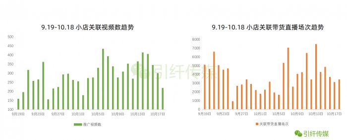 下图是新规出来后,与小店关联的视频和直播相关数据,国庆假期有轻微影响,直到10月9日新规正式实施,与小店关联的视频直播数据并没有太大的波动,整体仍在增长,这说明在新规前后,之前只用淘宝、京东等第三方商品来源链接的商家,没有放弃抖音这个商品曝光渠道,选择开通抖音小店,更为小店的推广布局做好了准备。