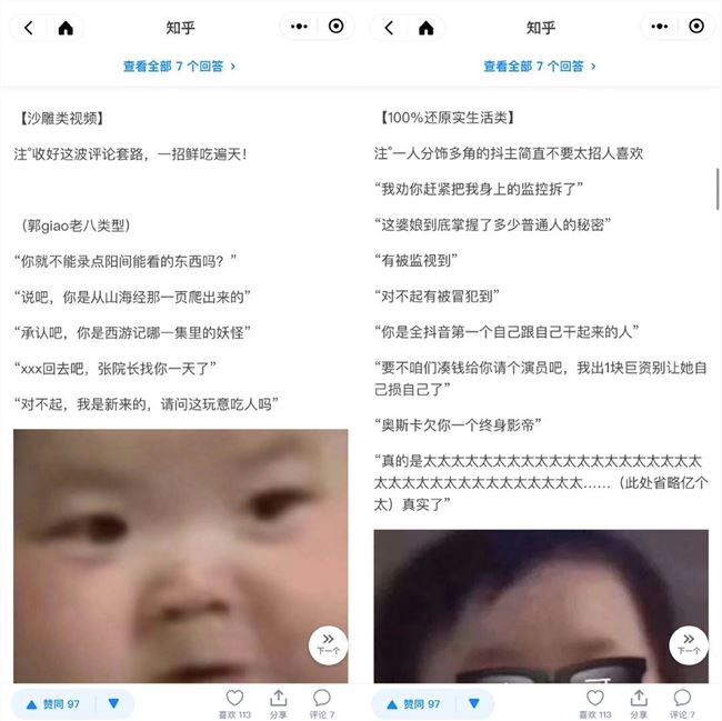 高赞答案中,用户@无糖橙汁把抖音分为恋爱类、沙雕类、生活类、颜值类、求赞类等几个小类,分别罗列了一批抖音常用的万能句式。