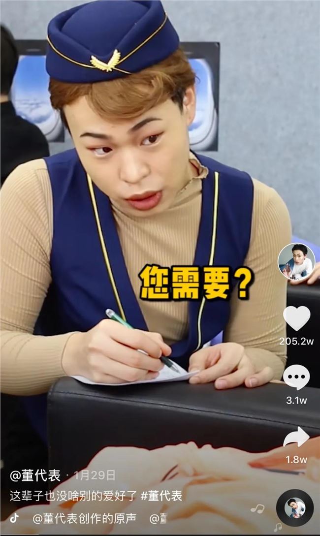 无论是置顶作品点赞数最高的飞机头等舱与经济舱剧情场景,还是最新作品的办公室的职场场景,其实董代表的作品搞笑通常不是第一位。贴近生活,降低距离感,引发粉丝们的共鸣,才是他一路坚持的设定。