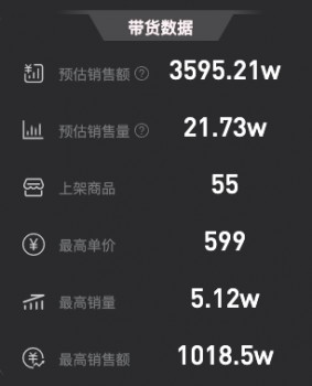 在当场直播展示的 55 款商品中,一款作为衣哥粉丝专属福利的时尚休闲羽绒服,现场卖出 5 万多件,单品销售额达到了1018. 5 万,成为了本场直播当之无愧的销售冠军产品。