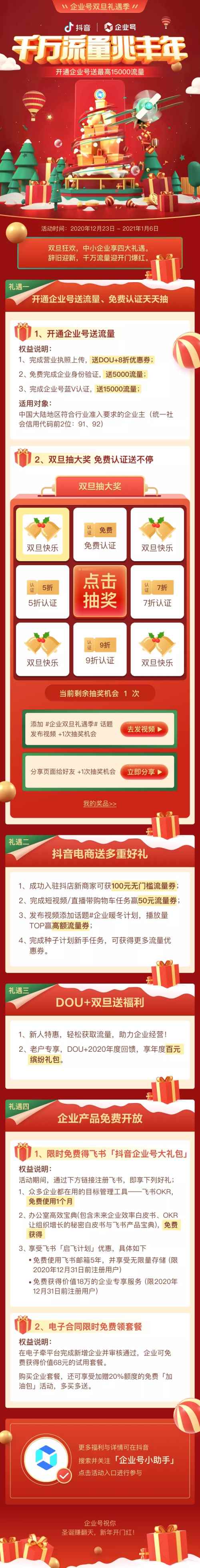 此外,企业还可参与双旦抽大奖活动,奖项包括企业号蓝V免费认证、5折认证、7折认证及9折认证多重权益。活动期间用户每天有1次抽奖机会,分享抽奖页面给好友或发布视频添加#企业双旦礼遇季 话题,均可增加1次抽奖机会。