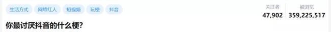 其实远远不止这几种类型,太多太多了,只有你想不到,没有他们做不到。而且在知乎上「你最讨厌抖音的什么梗?」浏览量3.59亿。
