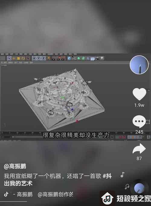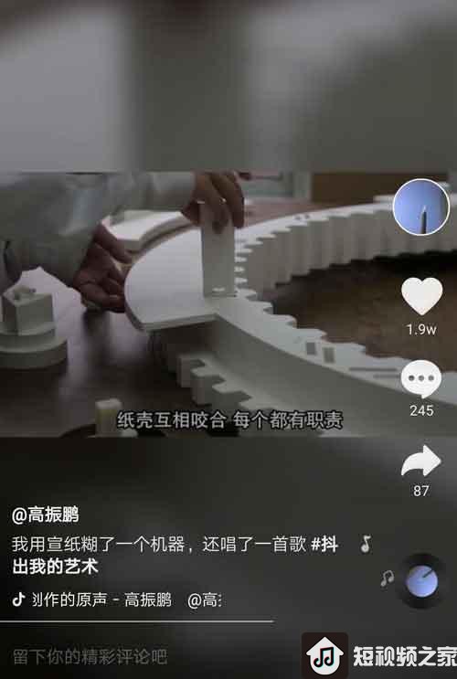 带动四周的纸壳,纸壳互相咬合,每个都有职责,纸没有螺纹连接只能靠卯榫,要做卯榫需要尺寸精准”。高振鹏的纸机械作品搭配上精彩的说唱,视频在抖音一经发布,立刻圈粉无数。