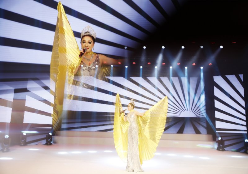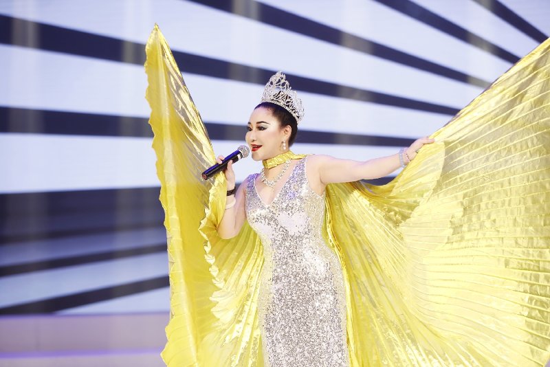 随着悠扬,欢快的音乐响起,黄丽达展着两个金色的披风翅膀、身着银色晚礼服,头戴皇冠,犹如英国皇室贵族,又如世界环球选美夫人般,金光闪闪,艳光四射地闪亮登场…一张口浑厚圆润、具有穿透力的美声唱法的歌声气势磅礴…热情、大气、震撼…让现场观众感觉仿佛身处在超大型的世界歌剧院里在欣赏节目…观众给出了热烈的掌声…可喜可贺,黄丽达在这一次的群星汇演中,顺利地获得了金奖。