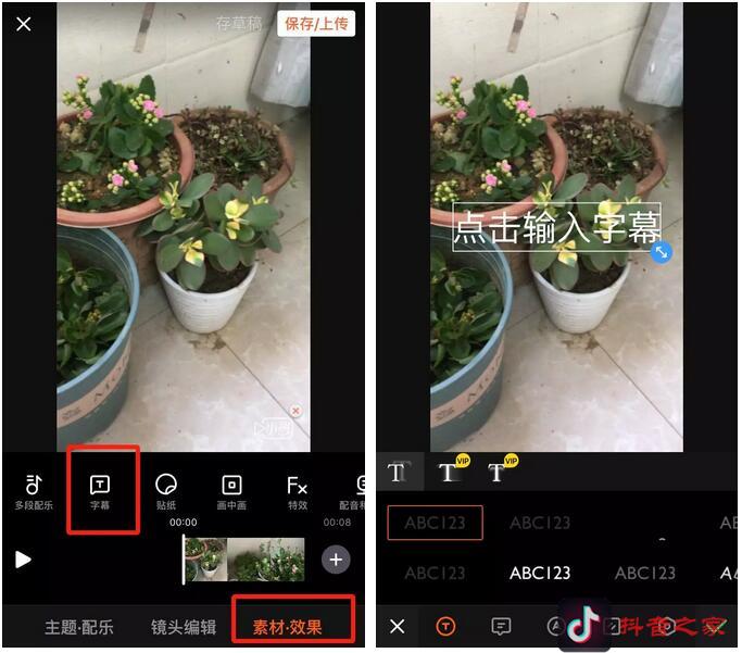 第二步:点击下一步,进入到编辑页面,点击素材效果,然后就可以添加字幕。