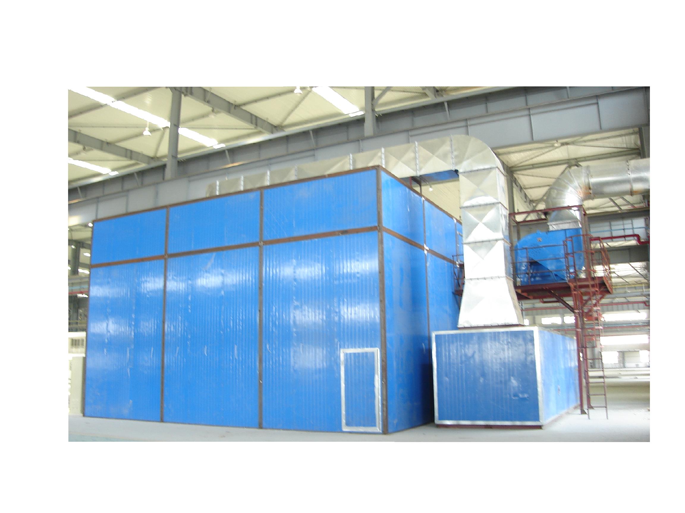 干式喷烘室采用耐高温玻璃纤维层进行漆雾过滤,结构简单,设备投资省,漆雾处理效果较好。但当漆雾处理装置中的吸附量达到一定程度时,室内的气流变弱,气流阻力加大,需更换过滤层,维护工作量相对较大,运行成本相对较高。适用于喷涂量较小的情况。