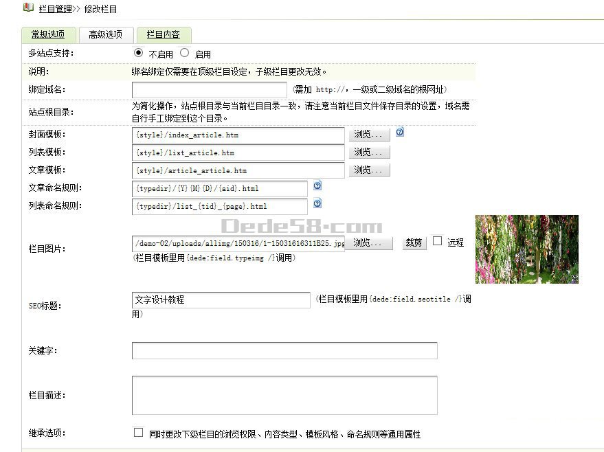 栏目图片的添加或修改图片时在 (栏目管理>高级选项)里面就会自动出现栏目图片添加的选择,点击选择图片,弹出窗口内选择浏览上传就OK。