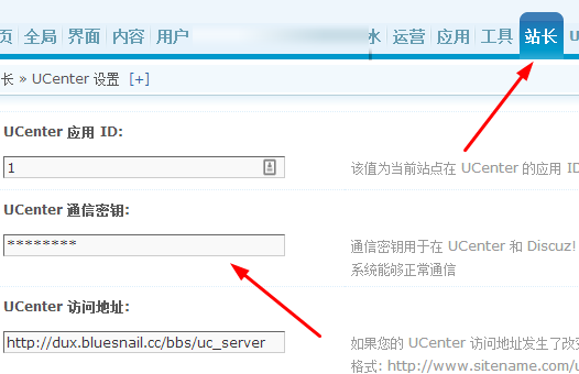如果通信不成功.就点击id为1应用,点击 后面的编辑,注意,应用iP地址留空不填,并复制通信密钥,粘贴到bbs后台,站长->ucenter设置,通信密钥中保存.ucenter ip地址也要留空不填.保存后,工具中,更新下缓存