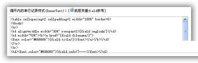 以下为引用的内容: <table cellspacing=2 cellpadding=2 width="100%" border=0> <tbody> <tr> <td align=middle width="30%" rowspan=2>[field:imglink/]</td> <td width="70%"><b><a href="[field:filename/]"> <font color="#666666">[field:title/]</font></a></b></td> </tr> <tr> <td><font color="#808080">[field:info/]……</font></td> </tr> </tbody> </table> |