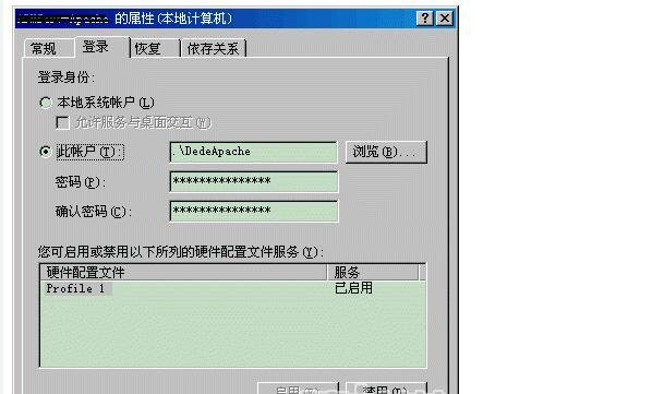 4.3.计算机管理里面选择服务,找到apache2.2,先停止服务,右击->属性,选择登陆,把单选框从本地系统帐户切换到此帐户,然后查找选择DedeApache,输入密码DedeApachePWD,然后点确定(这个时候apache还不能正常启动,一般情况肯定会报错:Apache2.2 服务因1 (0x1) 服务性错误而停止。);