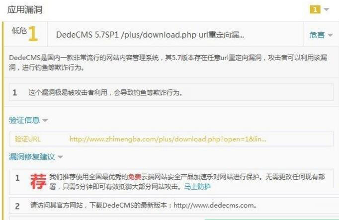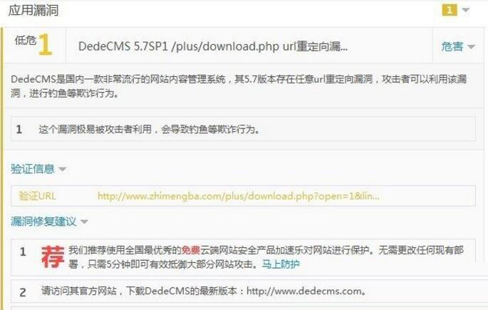 最近使用scanv网站体检发现有DedeCMS 5.7SP1 /plus/download.php url重定向漏洞(如下图),对比官方网站最新下载包发现该漏洞未进行补丁,但官方自身网站已经补上了,而官方演示站点均未补上。
