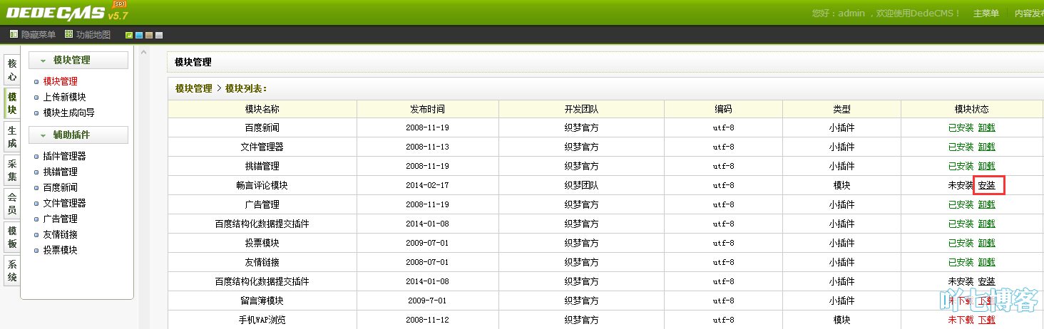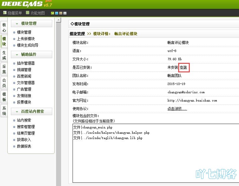 3、如果您安装dedecms的时候没有勾选安装自带的畅言模块,请进入【模块】-【模块管理】,在【畅言评论模块】后方点击“安装”