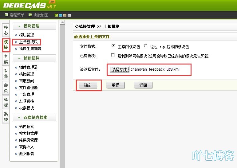 4、进入【模块】-【上传新模块】,选择解压得到的changyan_feedback_utf8.xml 文件,点击确定