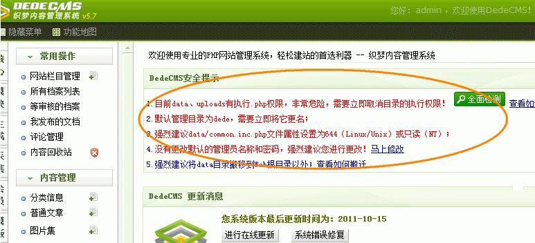 织梦dedecms系统运行对系统目录的权限是有非常严格的需求的,用户需要按照安全设置对自己的站点目录权限进行配置,同时在更新中我们加入了安全检测工具。点击后台系统首页提示中的“全面检测”,或者展开首页面板中的“系统信息”,点击“ 织梦dedecms目录权限检测工具”,来进行权限检测(如图2)。