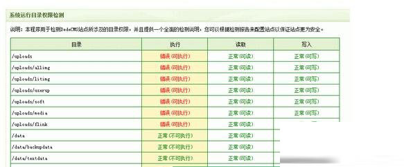 这里分别对织梦dedecms模板系统涉及到的站点目录中执行、读取、写入权限进行检测,尤其是执行权限,是安全设置中的重要环节。
