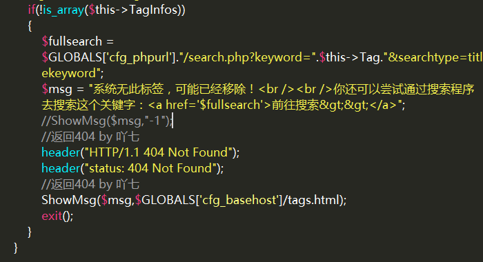 $msg = "系统无此标签,可能已经移除!<br /><br />你还可以尝试通过搜索程序去搜索这个关键字:<a href='$fullsearch'>前往搜索>></a>"; ShowMsg($msg,"-1");